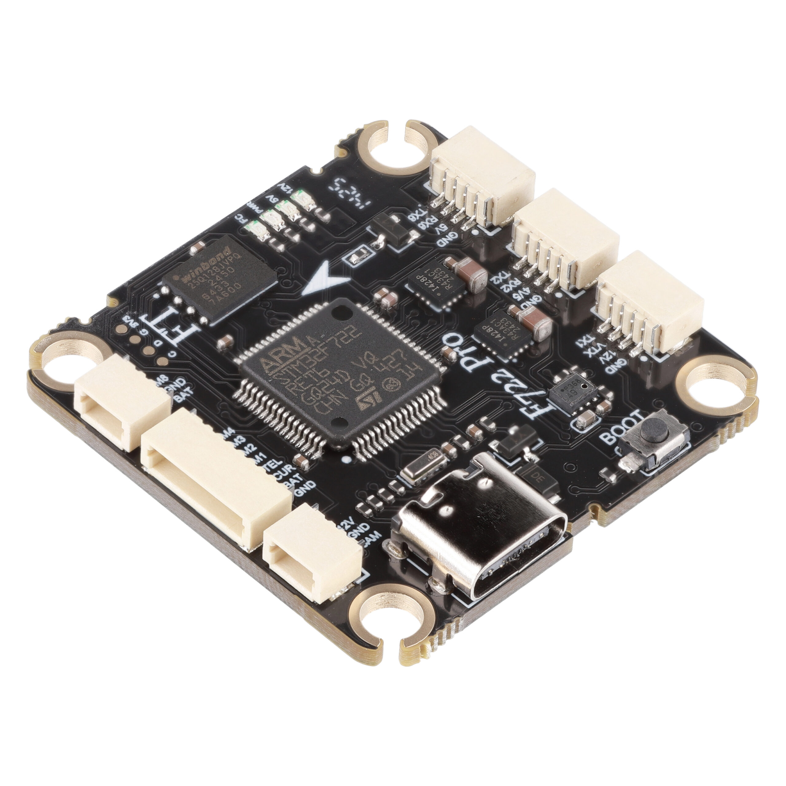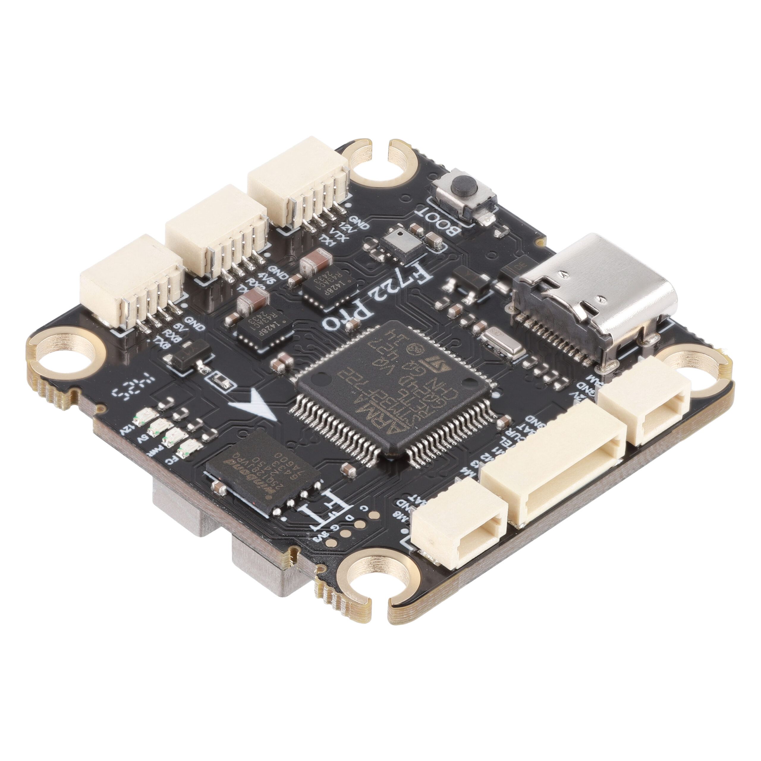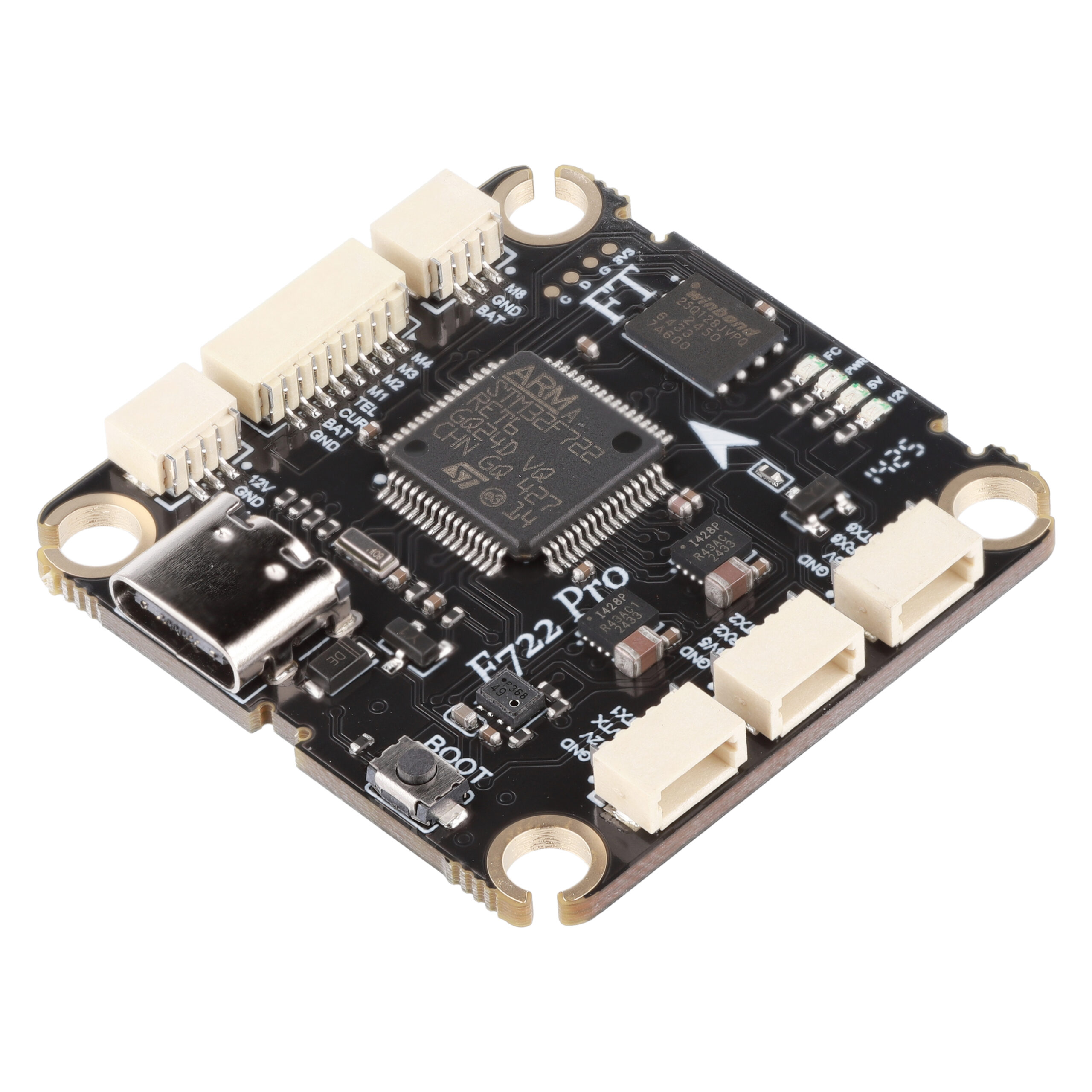 FC F722 PRO — це професійний контролер керування польотом, побудований на основі STM32F722RET6 (216 МГц), що забезпечує високу продуктивність, надійність і повну сумісність із сучасними FPV та автономними системами.